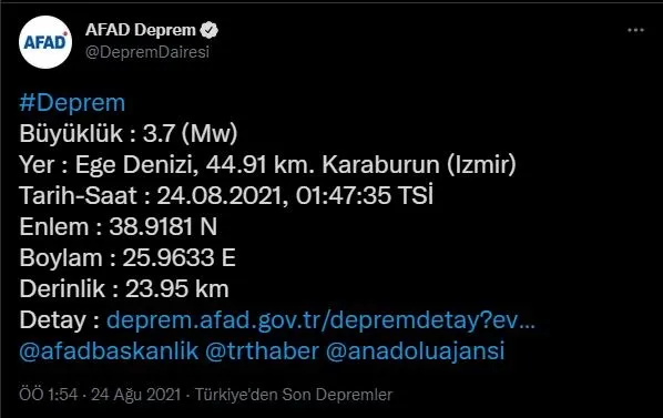 AFAD'dan gelen son dakika haberine göre, İzmir'in Karaburun ilçesinde 3.7 şiddetinde deprem meydana geldi.