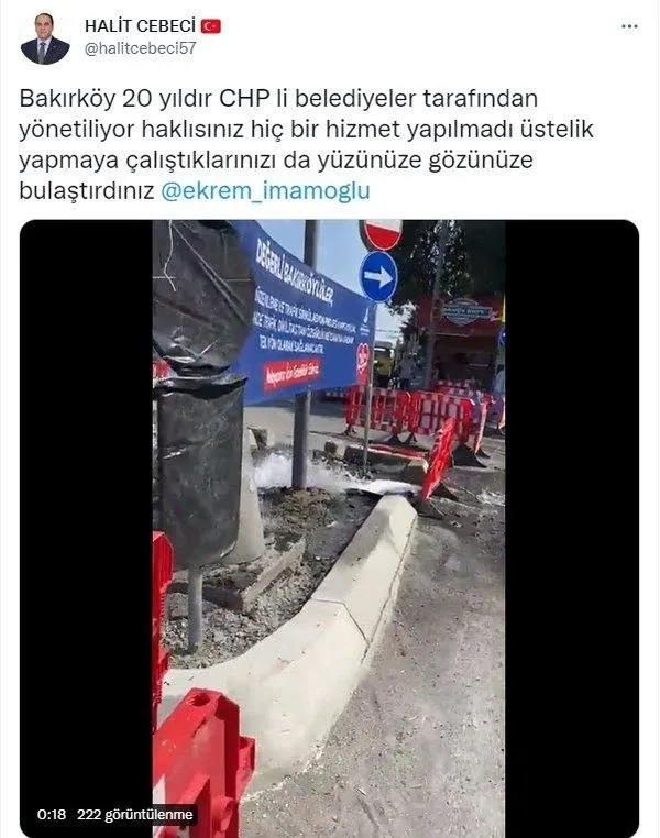 AK Parti Bakırköy İlçe Belediyesi Meclis Üyesi Halit Cebeci, "Bakırköy 20 yıldır CHP'li belediyeler tarafından yönetiliyor haklısınız hiçbir hizmet yapılmadı üstelik yapmaya çalıştıklarınızı da yüzünüze gözünüze bulaştırdınız" dedi.