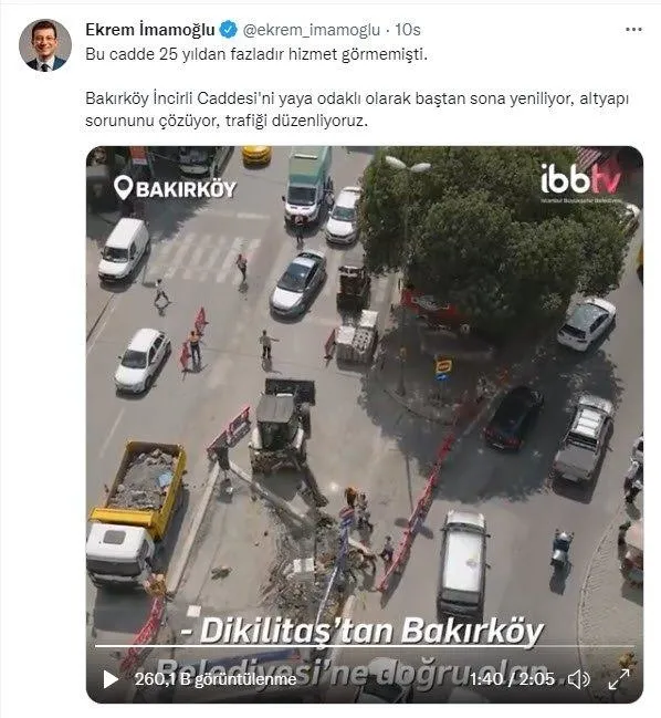 20 yıldır CHP yönetiminde olan Bakırköy'ün videosunu paylaşan İmamoğlu, "Bu cadde 25 yıldan fazladır hizmet görmemişti. Bakırköy İncirli Caddesi'ni yaya odaklı olarak baştan sona yeniliyor, altyapı sorununu çözüyor, trafiği düzenliyoruz." ifadelerini kullandı.