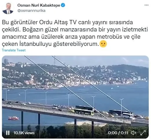 AK Parti İstanbul İl Başkanı Osman Nuri Kabaktepe, sosyal medya hesabından yaptığı paylaşımda "Bu görüntüler Ordu Altaş TV canlı yayını sırasında çekildi. Boğazın güzel manzarasında bir yayın izletmekti amacımız ama üzülerek arıza yapan metrobüs ve çile çeken İstanbulluyu gösterebiliyorum." ifadelerine yer verdi.