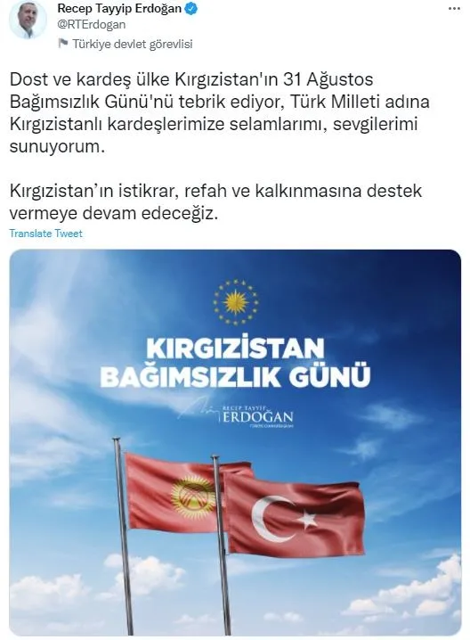 Başkan Erdoğan paylaşımında, "Dost ve kardeş ülke Kırgızistan'ın 31 Ağustos Bağımsızlık Günü'nü tebrik ediyor, Türk Milleti adına Kırgızistanlı kardeşlerimize selamlarımı, sevgilerimi sunuyorum. Kırgızistan'ın istikrar, refah ve kalkınmasına destek vermeye devam edeceğiz." ifadelerini kullandı.