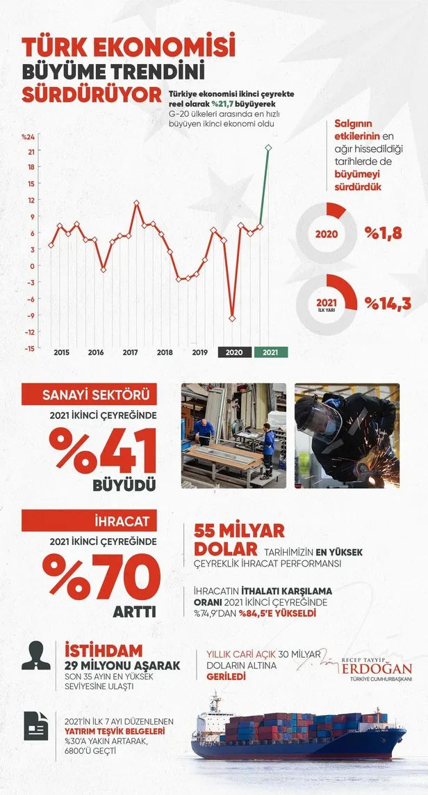 Sanayi üretimi ikinci çeyrekte yüzde 41 artarak, bu denli güçlü bir büyümenin gelişini önden haber vermiştir. Sanayi üretimimizin aylık olarak son 14 ayda 13 defa artmış olmasına özellikle dikkatlerinizi çekiyorum. İhracatımız ise ikinci çeyrekte yüzde 70 artarak, 55 milyar dolarla tarihimizin en yüksek çeyreklik performansını elde etti. İhracatın ithalatı karşılama oranı ikinci çeyrekte yüzde 74,9'dan yüzde 84,5'e yükseldi. Son 12 aylık ihracatımız tarihimizde ilk kez 200 milyar doları aştı. İhracattaki bu başarımızın da etkisiyle cari açığımız düşüşünü sürdürerek 30 milyar doların altına geriledi. İstihdam, salgın öncesi dönemi de geçerek son 35 ayın en yüksek seviyesine ulaştı ve 29 milyonu aştı."