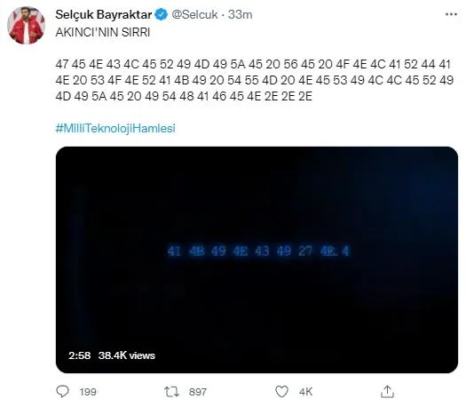 Başkan Recep Tayyip Erdoğan'ın yazdığı mesaj, Baykar'ın milli ve özgün olarak tasarlayıp geliştirdiği Bayraktar AKINCI TİHA'nın 6 Aralık 2019'daki ilk uçuşundan saatler önce uçuş kontrol bilgisayarının içindeki gömülü yazılıma eklendi.