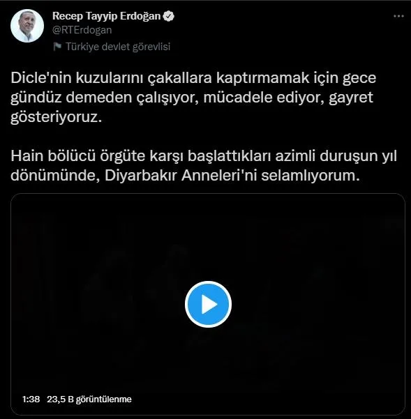 Son dakika haberi...Başkan Recep Tayyip Erdoğan, sosyal medya hesabından Diyarbakır annelerinin mücadelelerine yer verdiği videolu paylaşımında, "Dicle'nin kuzularını çakallara kaptırmamak için gece gündüz demeden çalışıyor, mücadele ediyor, gayret gösteriyoruz. Hain bölücü örgüte karşı başlattıkları azimli duruşun yıl dönümünde, Diyarbakır annelerini selamlıyorum." ifadelerini kullandı.