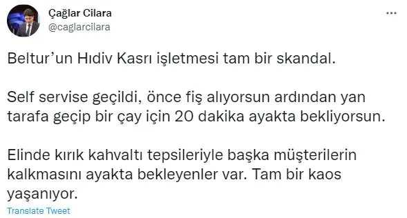 İşletmedeki işbilmezlik son olarak muhalif yayıncılığıyla bilinen Çağlar Cilara'yı da isyan ettirdi. Cilara, sosyal medya hesabından yaptığı paylaşımda "Beltur'un Hıdiv Kasrı işletmesi tam bir skandal. Self servise geçildi, önce fiş alıyorsun ardından yan tarafa geçip bir çay için 20 dakika ayakta bekliyorsun. Elinde kırık kahvaltı tepsileriyle başka müşterilerin kalkmasını ayakta bekleyenler var. Tam bir kaos yaşanıyor." dedi.