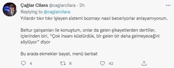 Cilara, eleştirilerine "Yıllardır tıkır tıkır işleyen sistemi bozmayı nasıl beceriyorlar anlayamıyorum. Beltur çalışanları ile konuştum, onlar da gelen şikayetlerden dertliler, içlerinden biri, "Çok insanı küstürdük, bir gelen bir daha gelmeyeceğini söylüyor" diyor Bu arada ekmekler bayat, menü berbat" sözleriyle devam etti.