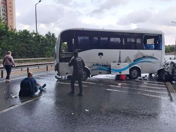 Ümraniye'de yağmur nedeniyle kayganlaşan yolda sürücünün kontrolünden çıkan servis midibüsü önce alt geçidin duvarına sonra da önünde seyreden otomobile çarptı. Kazada 1'i ağır 6 kişi yaralandı.