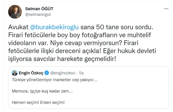 CHP'li Özkoç skandal kareleriyle ilgili sessizliğini korurken sosyal medyadan tepkiler çığ gibi büyüdü. Akademisyen Selman Öğüt, Özkaç "Firari fetöcülerle boy boy fotoğrafların ve muhtelif videoların var. Niye cevap vermiyorsun? Firari fetöcülerle ilişki dereceni açıkla! Eğer hukuk devleti işliyorsa savcılar harekete geçmelidir!" şeklinde tepki gösterdi.