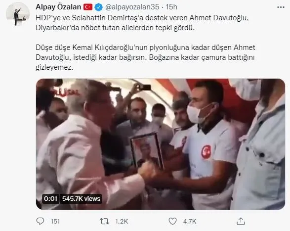 AK Parti İzmir Milletvekili Alpay Özalan, "HDP'ye ve Selahattin Demirtaş'a destek veren Ahmet Davutoğlu, Diyarbakır'da nöbet tutan ailelerden tepki gördü. Düşe düşe Kemal Kılıçdaroğlu'nun piyonluğuna kadar düşen Ahmet Davutoğlu, istediği kadar bağırsın. Boğazına kadar çamura battığını gizleyemez." dedi.