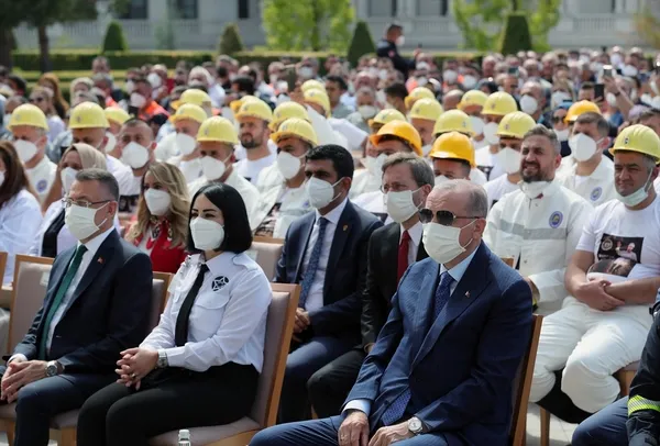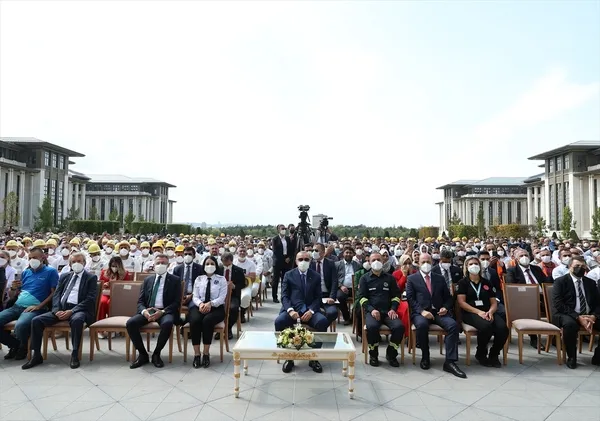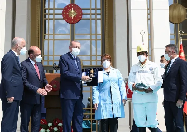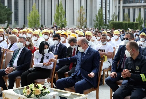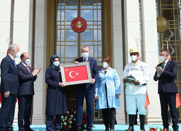 Konuşmasının ardından, Başkan Erdoğan'a işçiler, kendi elleriyle yaptıkları Türk bayrağı, baret ve feneri günün anısına takdim etti. Daha sonra aile fotoğrafı çektirildi.