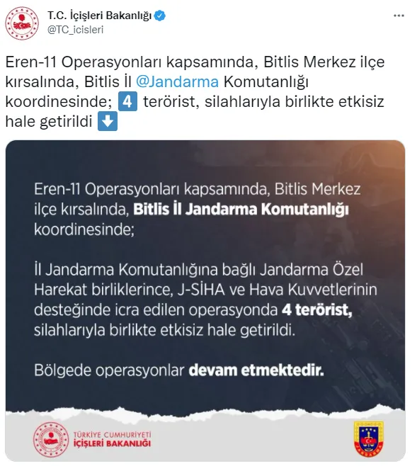 İçişleri Bakanlığı'ndan yapılan açıklamada, "Eren-11 Operasyonları kapsamında, Bitlis Merkez ilçe kırsalında, Bitlis İl Jandarma Komutanlığı koordinesinde; 4 terörist, silahlarıyla birlikte etkisiz hale getirildi" denildi.