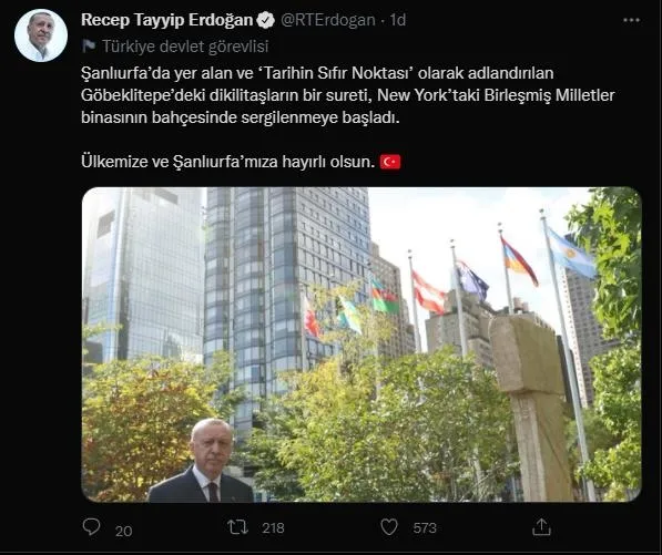 Erdoğan, sosyal medya hesabından yaptığı paylaşımda, "Şanlıurfa'da yer alan ve 'Tarihin Sıfır Noktası' olarak adlandırılan Göbeklitepe'deki dikilitaşların bir sureti, New York'taki Birleşmiş Milletler binasının bahçesinde sergilenmeye başladı.