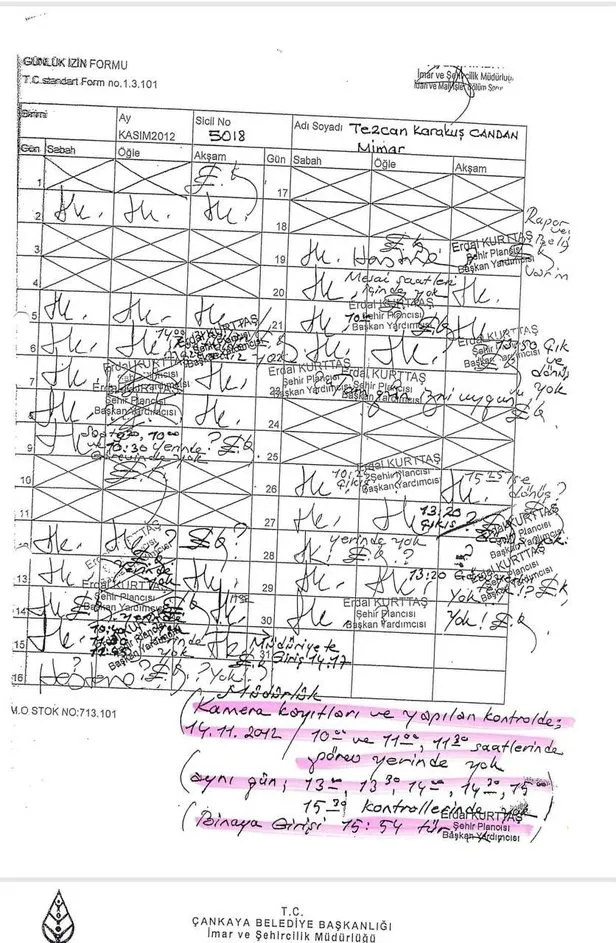 Çankaya Belediyesi Şehir Planlama Bölüm Sorumlusu Yasemin Asıl ile İmar ve Şehircilik İdari ve Mali İşler Bölüm Sorumlusu Aydın Nikbay'ın hazırladığı 6 Kasım 2012 tarihinde tutanakta da; Tezcan Karakuş Candan'ın izinsiz ve mazeretsiz olarak haber etmeksizin Çankaya Belediyesi'ndeki görev yerini terk ettiğine dikkat çekiliyor.