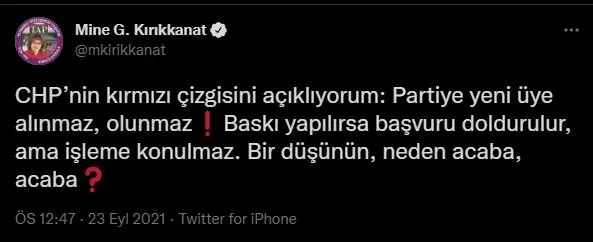 Twitter hesabından da benzer bir paylaşımda bulunan Kırıkkanat, "CHP'nin kırmızı çizgisini açıklıyorum: Partiye yeni üye alınmaz, olunmaz! Baskı yapılırsa başvuru doldurulur, ama işleme konulmaz. Bir düşünün, neden acaba, acaba?" dedi.