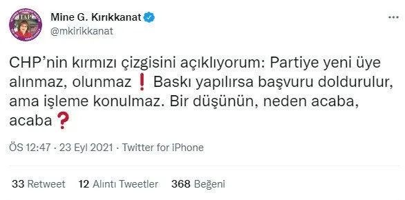 Twitter hesabından da benzer bir paylaşımda bulunan Kırıkkanat, "CHP'nin kırmızı çizgisini açıklıyorum: Partiye yeni üye alınmaz, olunmaz! Baskı yapılırsa başvuru doldurulur, ama işleme konulmaz. Bir düşünün, neden acaba, acaba?" dedi.