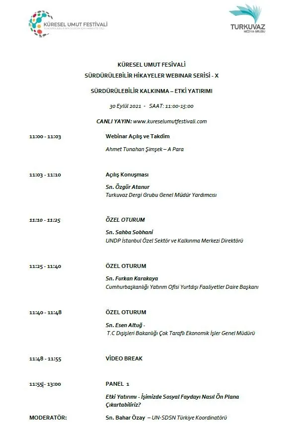 Turkuvaz Medya Grubu ve ekonomi dergisi InBusiness öncülüğünde sürdürülebilirlik konusunda farkındalık oluşturma misyonuyla başlatılan Küresel Umut Festivali kapsamında düzenlenen 'Sürdürülebilir Hikâyeler Webinar Serisi'nin sonuncusu 'Sürdürülebilir Kalkınma-Etki Yatırımı' başlığıyla 30 Eylül 2021 Perşembe günü gerçekleşecek.