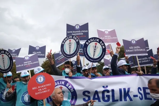 Sağlık çalışanlarından İBB önünde protesto! CHP'li Ekrem İmamoğlu’na kırmızı kart gösterdiler