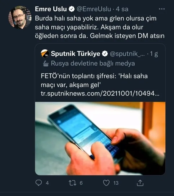 Kripto katiplere yönelik operasyona öfkelenen firari Uslu, mahrem imamların katipleri sohbetlere çağırırken kullandığı şifrelerden olan 'Halı saha maçı'yla ilgili bir paylaşım yaptı. Uslu, "Burada halı saha yok ama gelen olursa çim saha maçı yapabiliriz. Akşam da olur öğleden sonra da. Gelmek isteyen mesaj atsın" dedi.