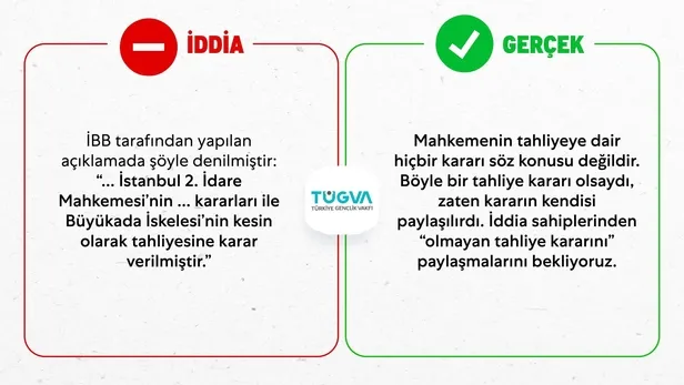 Açıklamada, İBB'nin, "İstanbul 2. İdare Mahkemesi'nin Büyükada İskelesi'nin kesin olarak tahliyesine karar verdiğini" ifade ettiği hatırlatılırken, "Mahkemenin tahliyeye dair hiçbir kararı söz konusu değildir. Böyle bir tahliye kararı olsaydı, zaten kararın kendisi paylaşılırdı. İddia sahiplerinden 'olmayan tahliye kararını' paylaşmalarını bekliyoruz." denildi.