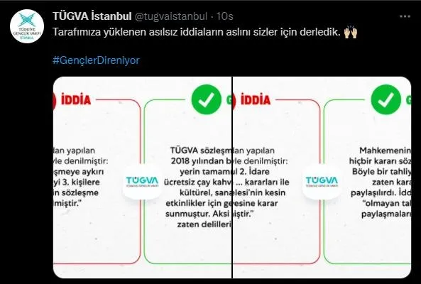 TÜGVA İstanbul'un Twitter hesabından, "Tarafımıza yüklenen asılsız iddiaların aslını sizler için derledik." notuyla paylaşım yapıldı.