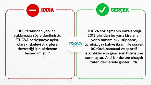 Paylaşımda, İBB tarafından yapılan açıklamada "TÜGVA sözleşmeye aykırı olarak iskeleyi 3. kişilere devrettiği için sözleşme feshedilmiştir." denildiği anımsatılarak, TÜGVA'nın sözleşmenin imzalandığı 2018 yılında bu yana kiralanan yerin tamamını kütüphane, ücretsiz çay kahve ikramı ile sosyal, kültürel, sanatsal ve sportif etkinlikler için gençlerin hizmetine sunduğu kaydedildi.