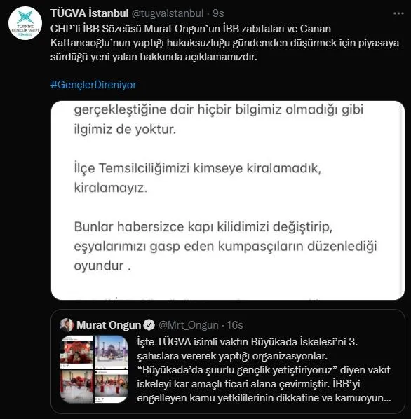 Türkiye Gençlik Vakfı (TÜGVA) İstanbul İl Temsilciliği, Adalar İlçe Temsilciliğinin tahliye edilmek istenmesine ilişkin İstanbul Büyükşehir Belediyesinin (İBB) öne sürdüğü iddialara sosyal medya üzerinden yanıt verdi.