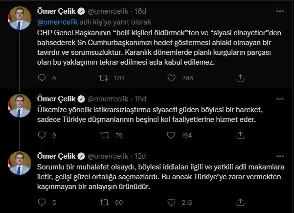 "CHP Genel Başkanı'nın 'belli kişileri öldürmek'ten ve 'siyasi cinayetler'den bahsederek Sayın Cumhurbaşkanımızı hedef göstermesi ahlaki olmayan bir tavırdır ve sorumsuzluktur. Karanlık dönemlerde planlı kurguların parçası olan bu yaklaşımın tekrar edilmesi asla kabul edilemez. Ülkemize yönelik istikrarsızlaştırma siyaseti güden böylesi bir hareket, sadece Türkiye düşmanlarının beşinci kol faaliyetlerine hizmet eder.