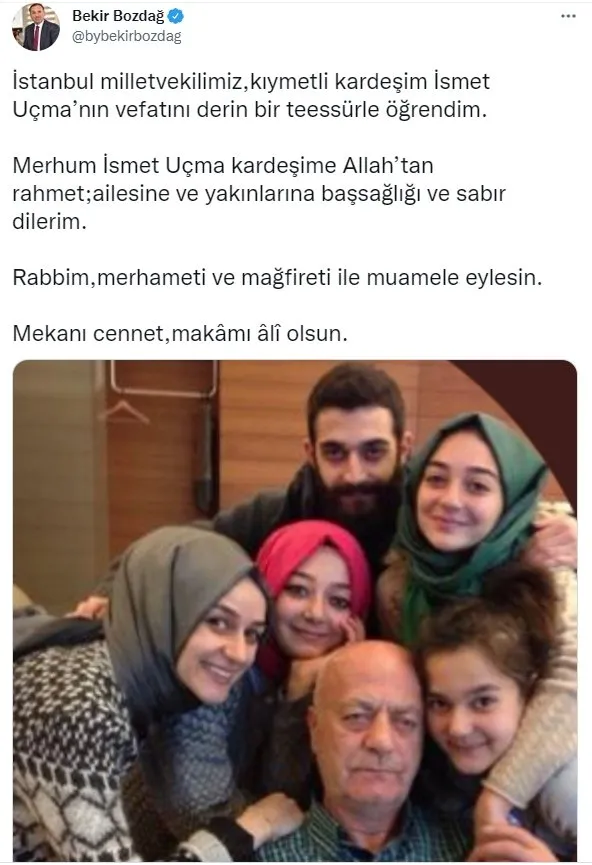 AK Parti Yozgat Milletvekili Bekir Bozdağ'da İsmet Uçma için, "İstanbul milletvekilimiz, kıymetli kardeşim İsmet Uçma'nın vefatını derin bir teessürle öğrendim. Merhum İsmet Uçma kardeşime Allah'tan rahmet; ailesine ve yakınlarına başsağlığı ve sabır dilerim. Rabbim, merhameti ve mağfireti ile muamele eylesin. Mekanı cennet, makâmı âlî olsun." mesajını paylaştı.