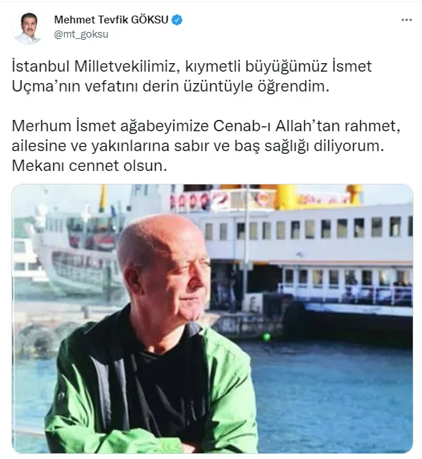 Esenler Belediye Başkanı Tevfik Göksu, "İstanbul Milletvekilimiz, kıymetli büyüğümüz İsmet Uçma'nın vefatını derin üzüntüyle öğrendim. Merhum İsmet ağabeyimize Cenab-ı Allah'tan rahmet, ailesine ve yakınlarına sabır ve baş sağlığı diliyorum. Mekanı cennet olsun." paylaşımını yaptı.
