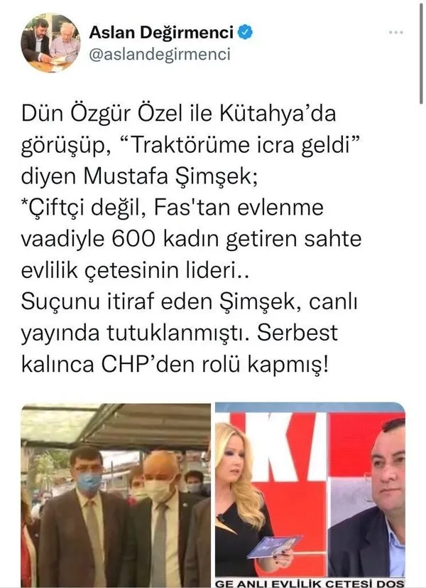Taciz, tecavüz ve yalanlara anılan Cumhuriyet Halk Partisi'nin adı her geçen gün bir skandala daha karışıyor. CHP'li Özgür Özel'in Kütahya gezisinde yanına gelen ve "Ben çiftçiyim, traktörüme icra geldi" diyerek dert yanan adamın çete lideri olduğu anlaşıldı. İsmi Mustafa Şimşek olan adamın Atv ekranlarında yayınlanan Müge Anlı'ya çıktığı, Fas'tan evlenme vaadiyle 600 kadın getiren çetenin lideri olduğu ve suçunu canlı yayında kabul ettiği ortaya çıktı.