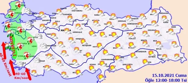 Parçalı ve çok bulutlu, Kıyı Ege, Denizli ve Uşak çevreleri ile Kütahya'nın batı ilçelerinin sağanak ve yer yer gök gürültülü sağanak yağışlı geçeceği tahmin ediliyor. Yağışların; İzmir, Aydın ve Muğla çevrelerinde kuvvetli, İzmir'in güney ve batı ilçeleri ile Aydın'ın kıyı kesimlerinde yerel olarak çok kuvvetli ve şiddetli olması bekleniyor. Rüzgarın; Güney Ege kıyılarında güney ve güneydoğu yönlerden kuvvetli olarak (40-60 km/saat) esmesi bekleniyor.