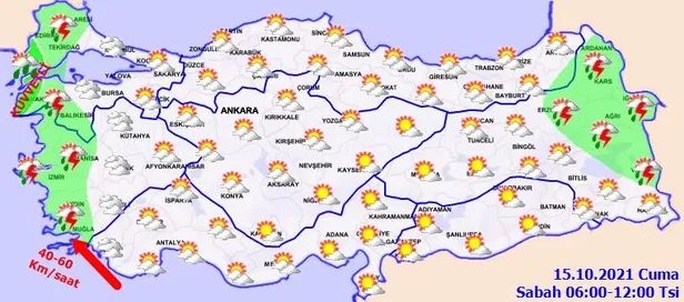 Meteoroloji Genel Müdürlüğü tarafından yapılan son değerlendirmelere göre, ülkemizin kuzey, iç ve batı kesimlerinin parçalı ve yer yer çok bulutlu, Marmara'nın batısı, Kıyı Ege, Doğu Anadolu'nun kuzeydoğusu, Uşak, Denizli, Van çevreleri ile Kütahya'nın batı ilçelerinin sağanak ve yer yer gök gürültülü sağanak yağışlı, diğer yerlerin az bulutlu ve açık geçeceği tahmin ediliyor. Yağışların; Edirne, Çanakkale, İzmir, Aydın ve Muğla çevrelerinde kuvvetli, İzmir'in güney ve batı ilçeleri ile Aydın'ın kıyı kesimlerinde yerel olarak çok kuvvetli ve şiddetli olması bekleniyor.