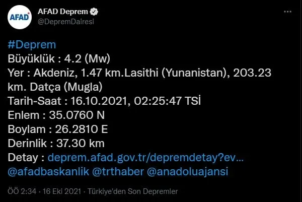 Son dakika haberi... AFAD'ın sosyal medya hesabı Twitter üzerinden yaptığı paylaşıma göre Muğla'nın Datça ilçesi açıklarında 4,2 büyüklüğünde deprem meydana geldi.