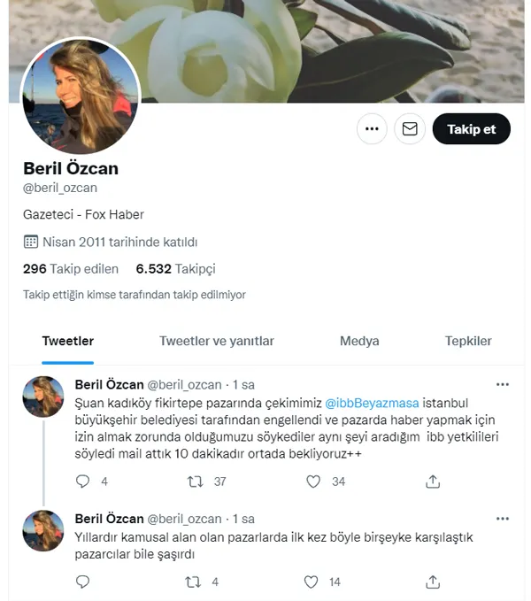 Konuyla ilgili Twitter hesabından paylaşımda bulunan Fox TV muhabiri Beril Özcan, "Şuan Kadıköy Fikirtepe pazarında çekimimiz İBB tarafından engellendi ve pazarda haber yapmak için izin almak zorunda olduğumuzu söylediler. Aynı şeyi aradığım İBB yetkilileri söyledi. Mail attık 10 dakikadır ortada bekliyoruz" dedi.