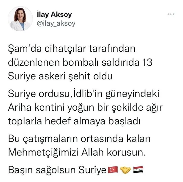 İP Kurucular Kurulu Üyesi İlay Aksoy, sosyal medya hesabından yaptığı paylaşımda "Şam'da cihatçılar tarafından düzenlenen bombalı saldırıda 13 Suriye askeri şehit oldu. Suriye ordusu, İdlib'in güneyindeki Ariha kentini yoğun bir şekilde ağır toplarla hedef almaya başladı. Bu çatışmaların ortasında kalan Mehmetçiğimizi Allah korusun. Başın sağolsun Suriye" ifadelerini kullandı.