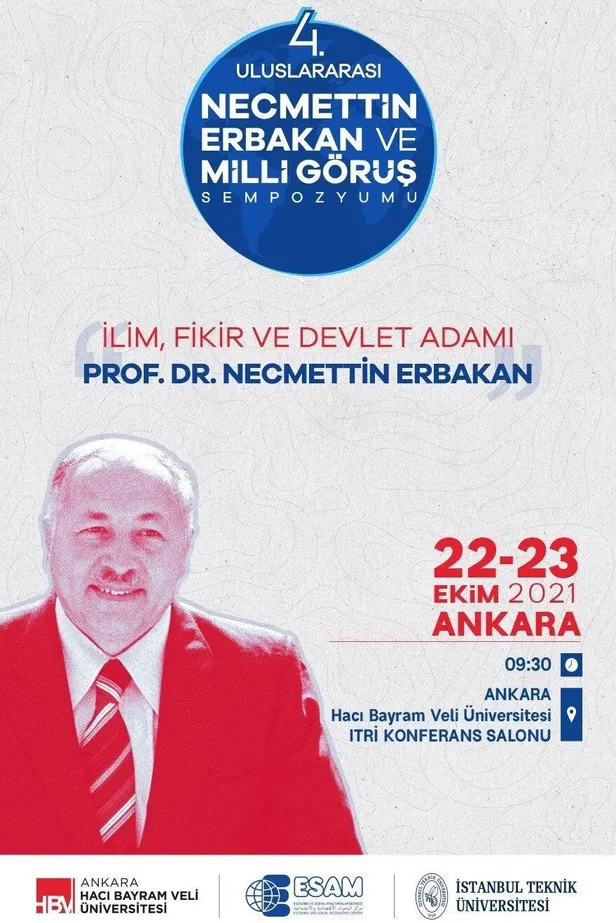 Dördüncü Uluslararası Necmettin Erbakan ve Milli Görüş Sempozyumu açılış programıyla başladı. İki gün sürecek olan sempozyumun açılış programına Başkan Recep Tayyip Erdoğan da video mesajla katıldı. Erbakan'ın hep hayali olan büyük, güçlü, müreffeh lider Türkiye'yi kurana kadar durmayacaklarını, 94 ruhu ve 2053 vizyonu ile çalışmaya devam edeceklerini kaydeden Erdoğan, "ESAM'ın düzenlediği bu sempozyum hem rahmetli Erbakan Hocamızın hatırasını yad etme, hem de geride bıraktığı çok yönlü mirası anlama bakımından faydalı olacağına inanıyorum. Sempozyumun hayırlara vesile olmasını temenni ediyor, Prof. Dr. Erbakan Hocamıza bir kez daha Allah'tan rahmet diliyorum." dedi.