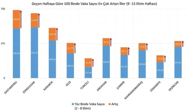 9-15 Ekim arasında vaka yoğunluğu bir önceki haftaya göre EN ÇOK ARTAN 10 İLİMİZ: Kastamonu, Zonguldak, Karabük, Kilis, Tunceli, Ardahan, Çankırı, Kahramanmaraş, Osmaniye, Erzincan.
