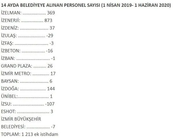 Soyer'in göreve geldiği 1 Nisan 2019'da belediyenin çalışan sayısı 27 bin 345'ken bu sayı, 1 Haziran 2020 itibariyle tam 28 bin 558'e çıktı. Çok sayıda HDP'liyi işe yerleştirerek dikkat çeken Soyer, kadroda toplam bin 213 kişilik artışa imza attı. Sadece İZENERJİ şirketinde 8 bin 116 olan çalışan sayısı 369 kişi artarak 8 bin 989'a çıktı. İZELMAN A.Ş'nin çalışan sayısı da 6 bin 358'den 873 kişilik artışla 6 bin 627'ye yükseldi. İZDOĞA A.Ş'de de çalışan sayısı 144 kişi artarak 2 bin 240'a fırladı.