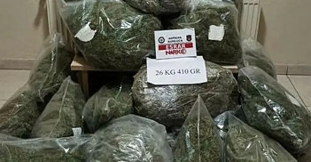 Şüphelilerin adreslerinde yapılan aramalarda, çuval ve poşetlere sarılı toplam 26 kilo 410 gram esrar ile uyuşturucu tartımında kullanılan hassas terazi ele geçirildi.