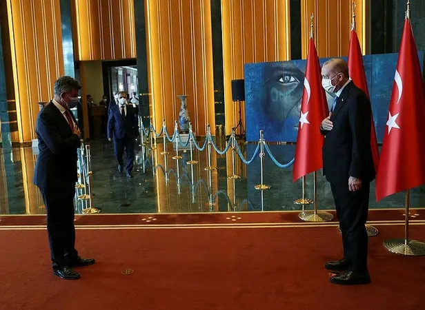 Salgın nedeniyle maske takan katılımcılar, sosyal mesafe kuralına uyarak Başkan Erdoğan ile uzaktan selamlaştı.