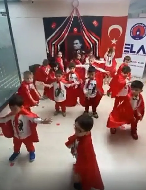 29 Ekim ritüelleri kapsamında özel bir anaokulunda gerçekleştirildiği belirtilen gösteride çocuklar önce dans etti.