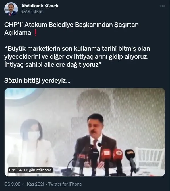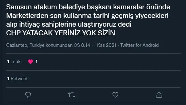 Bir başka sosyal medya kullancısı ise, "Samsun Atakum Belediye Başkanı kameralar önünde marketlerden son kullanma tarihi geçmiş yiyecekleri alıp ihtiyaç sahiplerine ulaştırıyoruz dedi. CHP YATACAK YERİNİZ YOK SİZİN" ifadelerini kullanarak tepkisini dile getirdi.