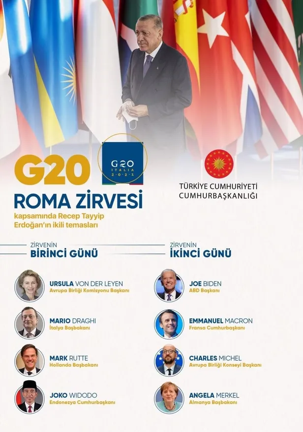 Erdoğan, "Zirve vesilesiyle, ev sahibi İtalya Başbakanı Sayın Draghi, Avrupa Birliği Komisyonu Başkanı Sayın Von Der Leyen, Hollanda Başbakanı Sayın Rutte, önümüzdeki G20'nin ev sahibi Endonezya Cumhurbaşkanı Sayın Widodo, Amerikan Başkanı Sayın Biden, Fransa Cumhurbaşkanı Sayın Macron, Avrupa Birliği Konseyi Başkanı Sayın Michel, Almanya Şansölyesi Sayın Merkel ile bir araya geldik. Tabi aday Şansölye ile de görüştük, hatta ikisi beraber geldiler. Yine zirve sırasında farklı ülkelerden katılımcılarla görüşmelerimiz oldu. Ziyaretim boyunca gerçekleştirdiğimiz istişarelerin ve ortaya koyduğumuz görüşlerin hayırlı sonuçlar doğurmasını temenni ediyorum." dedi.
