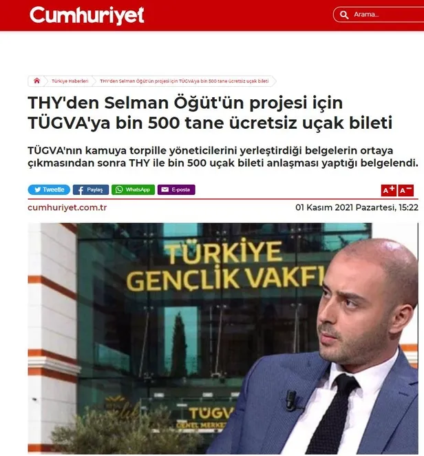Yurt dışında firari olarak yaşayan ve TKP, FETÖ ve PKK gibi terör örgütleri ile ilişkili ve bağlantılı olan etki ajanı Metin Cihan'ın THY ile TÜGVA arasındaki protokolü kirli para aklama gibi gösterdiği tweetini haber yapan sözde gazeteler, "THY'den Selman Öğüt'ün projesi için TÜGVA'ya bin 500 tane ücretsiz uçak bileti" haberiyle TÜGVA'ya saldırdılar.
