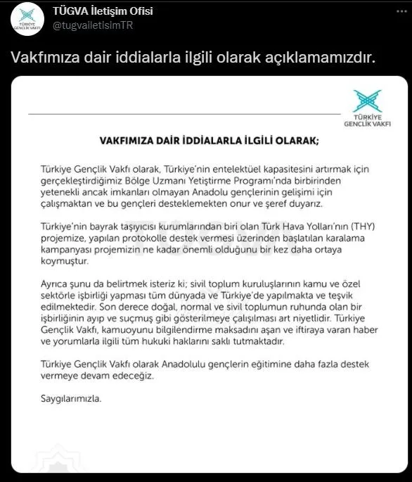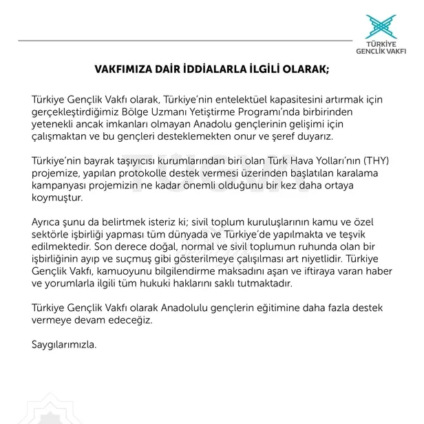 Türkiye Gençlik Vakfı, kamuoyunu bilgilendirme maksadını aşan ve iftiraya varan haber ve yorumlarla ilgili tüm haklarını saklı tutmaktadır." ifadelerine yer verildi.