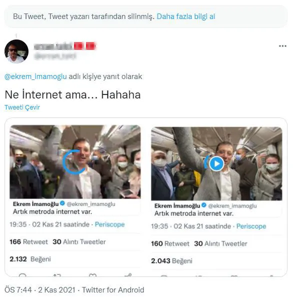 Yaklaşık 16 saniye süren 'metroda internet hizmeti' sosyal medyada dalga konusu olurken İBB Başkanı Ekrem İmamoğlu'nun hesabından atılan tweet kısa süre içerisinde silindi.