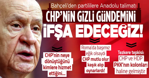 Son dakika haberleri... MHP Genel Başkanı Devlet Bahçeli partisinin grup toplantısında önemli açıklamalarda bulundu. Bahçeli, partililere Anadolu talimatı verdiğini açıklayarak, "Kökünden uzaklaşmış CHP'nin gerçek yüzünü her zeminde her yöremizde anlayacağız. CHP'nin en fazla oy aldığı 131 seçim bölgesinde HDP ile ittifakını insanlarımızla paylaşacağız. CHP'nin neye dönüştüğünü, kimlere hizmet ettiğini izah edeceğiz. " dedi. Bahçeli, G20 zirvesindeki Erdoğan-Biden görüşmesini manipüle etmeye çalışan muhalefete de sert çıktı. Bahçeli, "Roma'da başımız eğik olsaydı CHP mutlu olurdu kaşık alıp oynardı" ifadelerini kullandı.