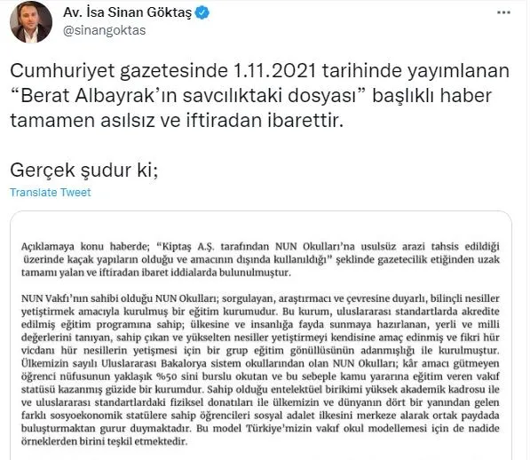 AK Parti MKYK Üyesi ve Avukat Sinan Göktaş, Cumhuriyet'in iddialarına yanıt verdi, "iddialar tamamen asılsız ve iftiradan ibarettir" dedi.