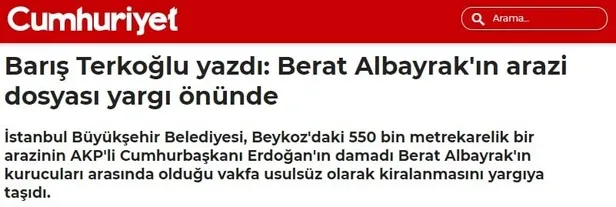 Çamur medyasının önde gelen markası Cumhuriyet yazarı Barış Terkoğlu, Eski Hazine ve Maliye Bakanı Berat Albayrak'ı ve NUN Vakfı'nı hedef alan bir habere imza atarak "İBB'ye ait araziyi AK Parti döneminde çok ucuza nasıl kapattı" şeklinde bir iftirayı gündeme getirdi.
