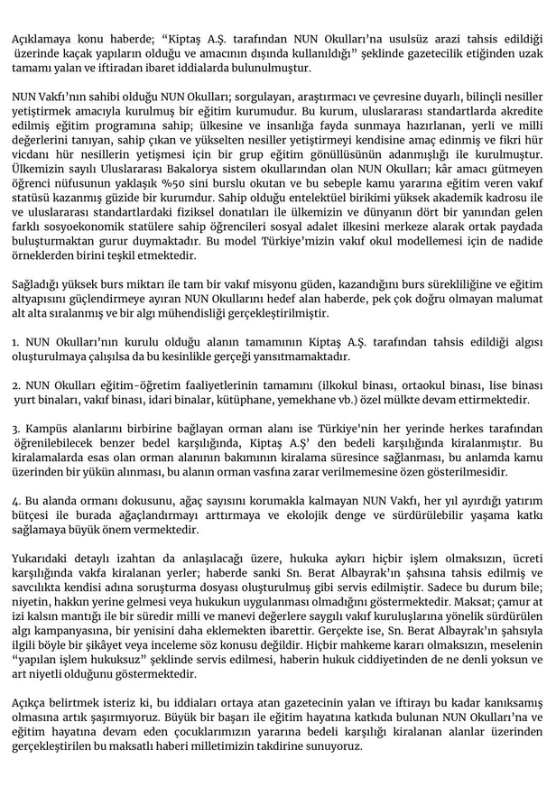 Açıklamaya konu haberde; "Kiptaş A.Ş. tarafından NUN Okulları'na usulsüz arazi tahsis edildiği üzerinde kaçak yapıların olduğu ve amacının dışında kullanıldığı" şeklinde gazetecilik etiğinden uzak tamamı yalan ve iftiradan ibaret iddialarda bulunulmuştur.